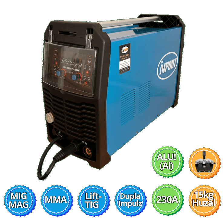 230 A. védőgázas MIG/MAG inverteres szinergikus, dupla impluz, hordozható hegesztőgép